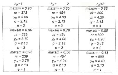 Pentru fiecare set de parametri hp si e, in tabela se inregistreaza urmatoarele tipuri de informatii: Dm(hp,e)_ssm - suma masurilor de similaritate ale regulilor; Dm(hp,e)_sysm - suma produselor intre masurile similaritatii si rezultatele regulilor; Dm(hp,e)_nr - numarul celulei de baza a raspunsului cu cea mai mare similaritate; Dm(hp,e)_g - factorul de liniarizare al raspunsului cu cea mai mare masura a similaritatii; Dm(hp,e)_maxsm - maximul masurii de similaritate a regulilor.