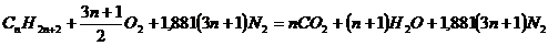 si, tinand seama de compozitia volumetrica a aerului atmosferic, 21 % oxigen si 79 % azot, rezulta ecuatia arderii stoechiometrice a unui kilomol de hidrocarbura in aer atmosferic: