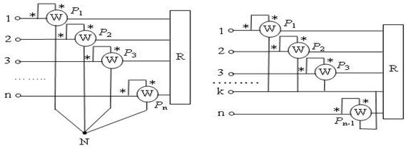 Potentialul punctului de referintǎ N este arbitrar, de aceea se poate alege chiar pe una dintre fazele circuitului, de exemplu pe faza k, numitǎ fazǎ de referintǎ. Se gǎseste astfel, schema de mǎsurare a puterii active cu n - 1 wattmetre.