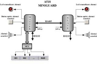A518 este format din doua automate care comunica intre ele prin interfata RS485. Unul dintre automate este master si are rolul de a monitoriza intrarile digitale, iar celalalt este slave si primeste de la master toate informatiile prin RS485.
