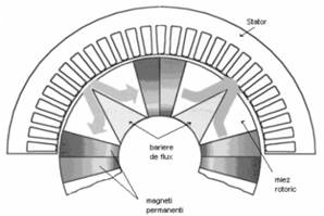 Masina sincrona cu excitatie cu magneti permanenti in doua variante - magneti in intrefier si respectiv magneti ingropati cu concentrare de flux [