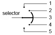 Selectorul comutatorului din figura alaturata realizeaza contactul (inchiderea circuitului) intr-una din cele cinci pozitii diferite. Pozitiile sunt numerotate de la 1 la 5. Configuratia cea mai des intalnita a unui comutator cu pas reglabil, este aceea in care contactul cu o anumita pozitie este deschis inainte de realizarea contactului (inchiderea contactului) cu pozitia urmatoare. Sub aceasta configuratie, comutatorul este cunoscut sub numele de comutator cu intrerupere.