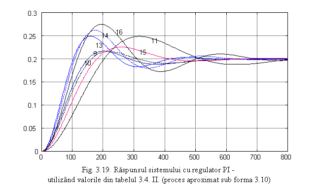 Daca se face un artificiu de calcul si se inlocuiesc cele doua constante de timp mari cu una singura T1=80+100=180, conform aceluiasi criteriu , rezulta un regulator PI cu functia de transfer (3.12), iar raspunsul sistemului in circuit inchis este prezentat in figura 3.13.