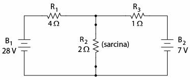 Caderea de tensiune intre cele doua puncte ale sarcinii poate fi dedusa din tensiunea uneia dintre bateriei si caderea de tensiune pe unul dintre rezistori, astfel:
