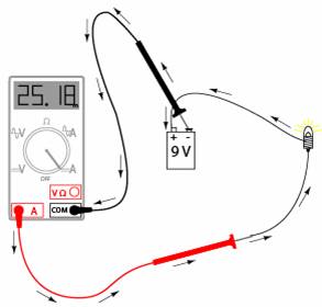 Aceasta reprezinta cea mai complexa si periculoasa aplicatie a multimetrului. Motivul este destul de simplu: curentul de masurat trebuie sa treaca prin aparatul de masura, ceea ce inseamna ca multimetrul trebuie integrat in circuit. Pentru a realiza acest lucru, circuitul initial trebuie oprit, iar multimetrul conectat intre cele doua puncte ale circuitului deschis. Pentru realizarea propriu-zisa a masuratorii, selectorul trebuie sa se afle in pozitia "A", fie in c.a., fie in c.c., iar sonda rosie trebuie introdusa in priza marcata cu "A" (vezi figura).