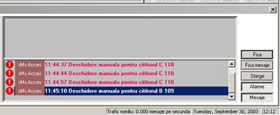 Monitorizarea subsistemului de control acces se face prin intermediul mesajelor ce apar in fereastra de mesaje a interfetei grafice si cu jutorul alarmelor din fereastra de alarme.