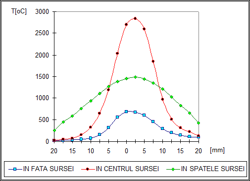 In figura 3.18 este aratata variatia transversala a temperaturii, determinata prin metodele cu elemente finite si experimentala, in centrul sursei termice. Se remarca faptul ca temperatura maxima determinata experimental este usor mai scazuta fata de cea determinata prin analiza cu element finit, iar temperaturile in imediata vecinatate a axei imbinarii sunt mai ridicate in ambele materiale.