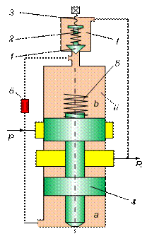 Pentru diminuarea fortei de actionare, pe tija 2 este plasat pistonul 3. Camera "a" este pusa in legatura cu conducta pompei. Astfel pistonul 3 serveste la ehilibrarea fortelor hidrostatice pe tija 2 a bilei. Forta de apasare a bilei pe scaun estedata numai de resortul 4 nu si de presiunea din sistem, cu toate ca bila se afla in camera in care pompa P refuleaza.