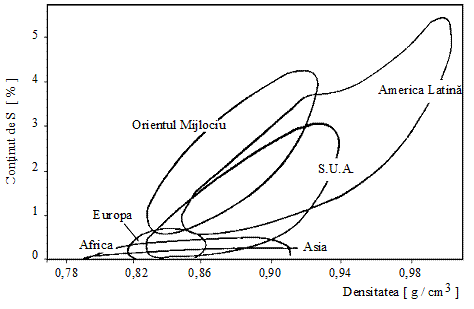 Fig. 2. Procentele de sulf si densitatea principalelor zacaminte petroliere.