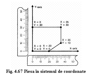 Pentru a introduce piesa intr-un sistem de coordonate cu doua axe, suprapunem una sau daca este posibil doua suprafete ale piesei peste axele sistemului (Fig.4.67), forma piesei putand fi descrisa prin determinarea pozitiei cotelor. Putem determina pozitia cotelor citind distanta relativa pe axele X si Y pentru fiecare cota.
