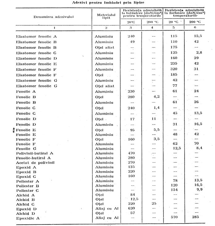 In functie de natura lor, adezivii pot fi utilizati pentru temperaturi de exploatare intre 20200°C. Unii adezivi speciali permit extinderea intervalului de temperatura intre 90.. .350°C. in tabelul din anexa 1 se prezinta unii adezivi si rezistenta lor la intindere si forfecare.