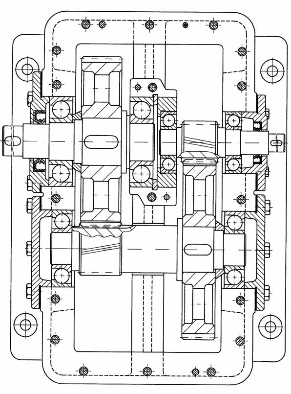 Reductoarele cilindrice coaxiale (fig.5) asigura atat incarcarea simetrica a arborilor, cat si reducerea substantiala a lungimii (inaltimii) reductorului, insotita de o crestere nesemnificativa a latimii acestuia, determinata de necesitatea utilizarii unui lagar interior, pentru sprijinirea arborilor de intrare si de iesire. Se obtine deci, in ansamblu, o reducere a gabaritului reductorului si se asigura conditia, uneori necesara, de coaxalitate a arborelui de intrare cu cel de iesire.