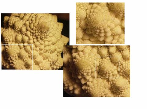 Fig. 8. Din punct de vedere calitativ structura unui brocoli (sau a unei conopide) este independenta de scara observatiei. Similar, macro-turbulenta (vestitele spirale stelare sau campurile devastate de furtuni pe Jupiter) se regaseste calitativ in turbulenta provocata de ingustarea unei conducte sau in